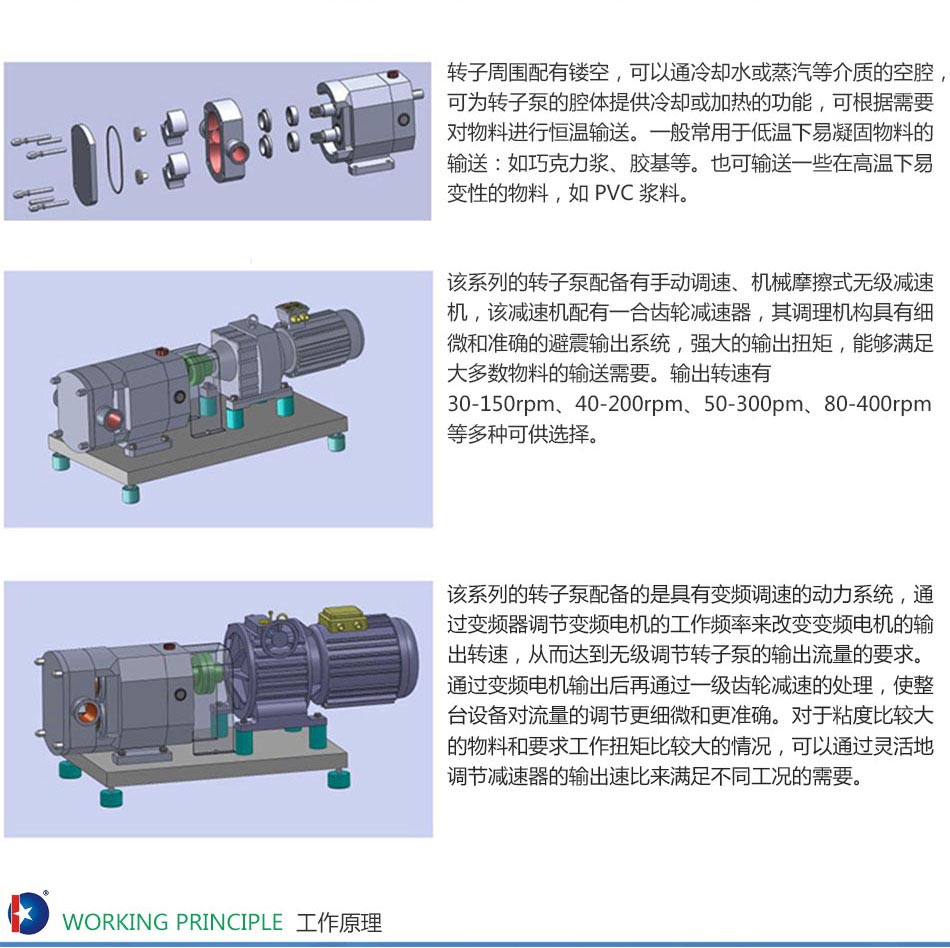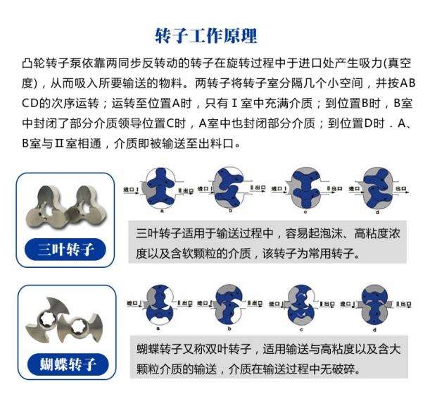 轉(zhuǎn)子泵采用的二葉、三葉、碟形、多葉型的轉(zhuǎn)子,是一種多用途的容積式輸送泵。它具有轉(zhuǎn)速低、輸出扭矩高、耐高溫、耐腐蝕等特點,是一種衛(wèi)生型的容積式輸送泵。其獨特的工作原理和特點體現(xiàn)在輸送高粘度、高溫度、高腐蝕性的物料中,其輸送過程平穩(wěn)、連續(xù),并且能夠保證物料在輸送過程中物理性能不被破壞,可輸送物料的粘度,可高達(dá)1,000,000CP。