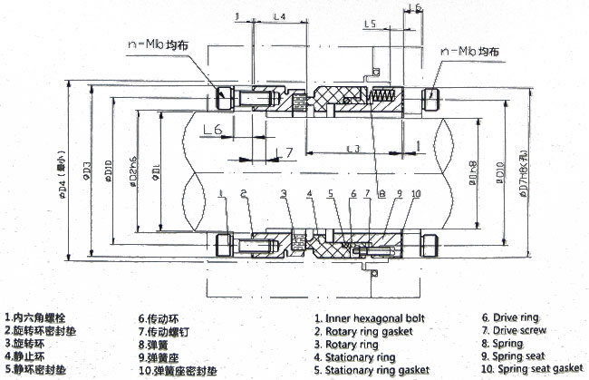 內(nèi)裝、單端面、多彈簧、平衡型、彈簧靜止型密封結(jié)構(gòu)。