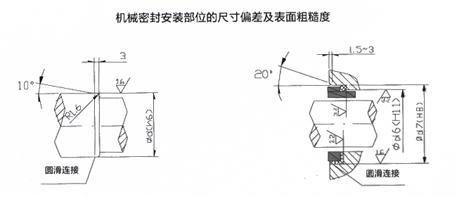 1、與機械密封所配軸和靜環(huán)座的尺寸公差、表面粗糙度和倒角過渡形狀見下圖;