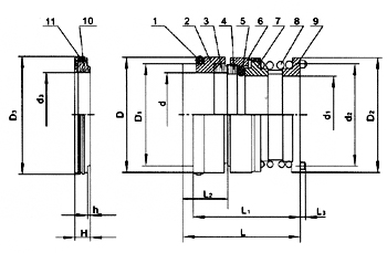 7、傳動套 8、彈簧 9、彈簧座 10、靜喚橡膠座 11、石墨靜環(huán)或碳化硅靜環(huán)